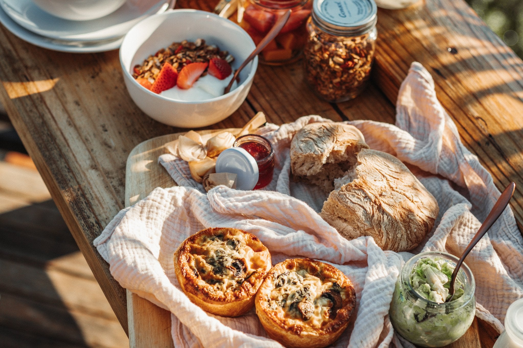 Breakfast includes:Quiche or croissants or breadsticks, fresh fruit, yogurt, granola, boiled eggs, condiments, fruit juice and milk.